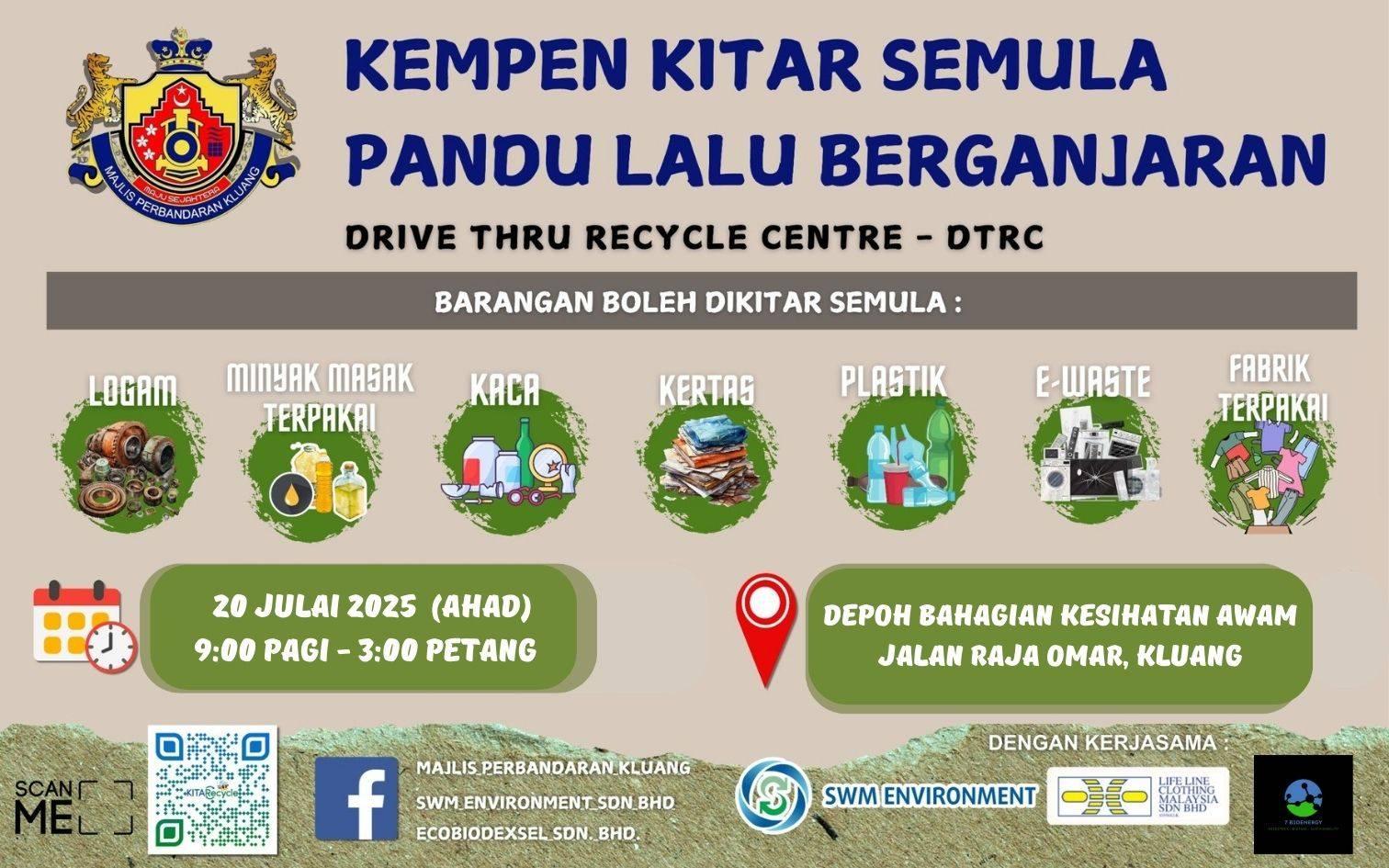Recycled items : Paper / Plastic / Aluminum Cans / Glass / E-Waste / Cooking Oil (RM 3 / 1 Kg)