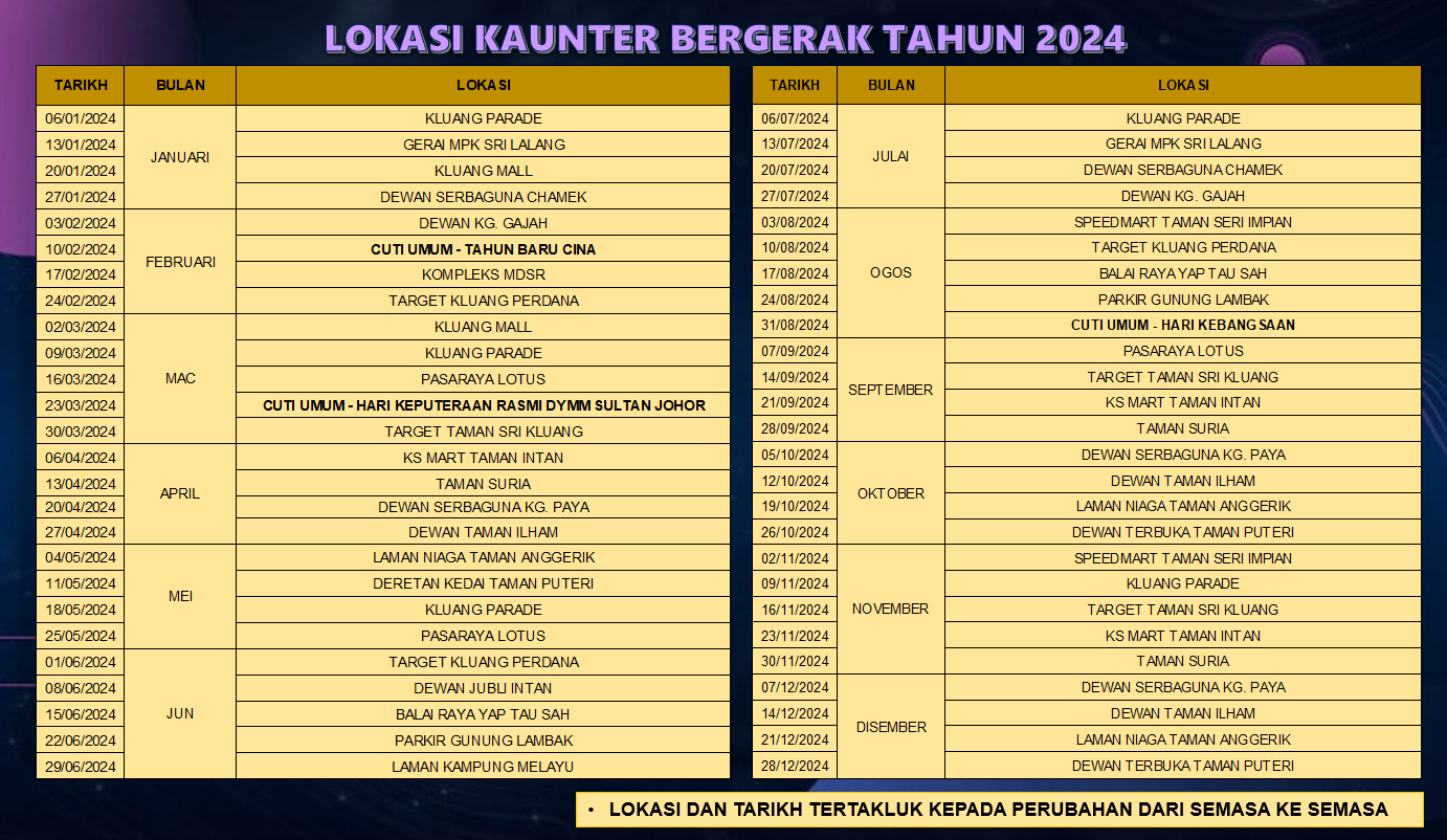 For more information on the Kluang Municipal Council Mobile Counter Schedule for 2024, please contact the Department/Division involved: 1. Jabatan Kewangan (Cukai) - 07-777 1466 2. Unit Tunggakan Hasil - 07-776 7703